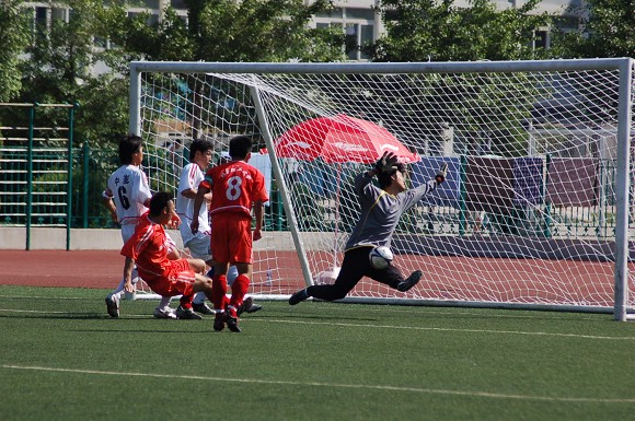 青島大學隊后衛眼見無法阻擋這個勢在必得的進球,只好從后面將袁微放倒在地,不但被裁判紅牌罰下,我隊也獲得了一次點球的機會。點球由上半場的進球功臣王緒主罰,可惜皮球打的太正,被對方守門員的腿部擋出界外,我方失去了繼續擴大比分的機會。