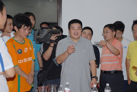 比賽一結束,球隊的冠名贊助商暨戰略合作伙伴——愛國者的總裁馮軍先生就興奮地跑向隊員中,代表華旗的1900人向金指導獻花,并向金指導和學生軍們表示了熱烈的祝賀。值得一提的是今天是馮軍先生的生日,在這個重要而特殊的日子,他攜親友和華旗的員工一起來為愛國者大學生隊加油助威,馮軍先生說今天隊員們的優異表現是他收到的最好的生日禮物。愛國者大學生隊頑強拼搏,不畏強敵,堅持到最后一分鐘,永不言敗,永不服輸。這正與愛國者的企業信念是一脈相承的。作為學生軍的冠名方和戰略合作伙伴愛國者,在中甲開賽以來的每場比賽中都給予了學生們極大的安慰和鼓勵。無論是主場還是客場,他們都組織了強有力的助威陣容,為場上的隊員們搖旗吶喊,無論輸贏,他們都是那樣熱烈地鼓舞著他們的球隊,為他們加油。他們說,因為我們是一個大團隊,我們要相互支持和鼓勵。
