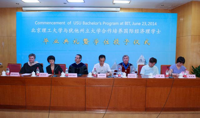 2014年6月23日下午,國際教育學院在北理工國際教育交流中心三層報告廳隆重舉行了北京理工大學與美國猶他州立大學合作辦學項目第八屆學生畢業典禮。出席畢業典禮的有猶他州立大學副教務長Robert W. Wagner教授及其助理John Mortensen先生、亨茨曼商學院國際項目學術主任Dwight Israelsen教授、北京理工大學孫逢春副校長、國際交流合作處邢清清副處長、國際教育學院梅文博院長、羅佳書記、蔣志湘副院長、學院部分教職工、全體畢業生及部分學生家長。梅文博院長主持典禮。