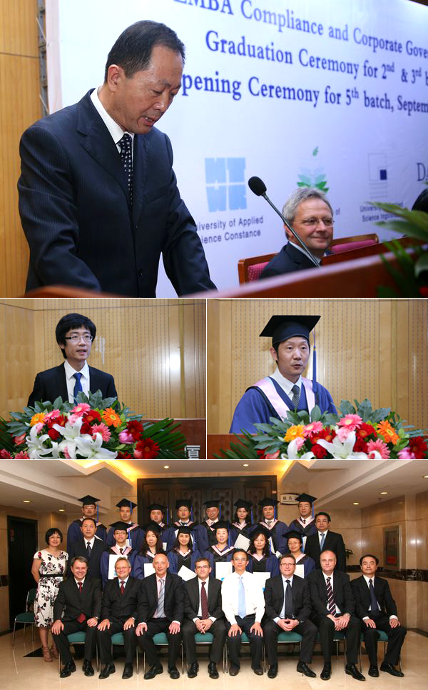 2011年9月2日下午,我校與德國康斯坦斯應用科學大學合作為國際著名奔馳汽車生產商戴姆勒公司舉辦的第二、三期EMBA班畢業(yè)典禮暨第五期新生開學典禮,在北京理工大學國際教育交流中心三層報告廳隆重舉行。出席典禮的嘉賓有:北京理工大學副校長孫逢春教授,戴姆勒東北亞地區(qū)首席財務官Helmut Ruhl先生,梅塞德斯奔馳(中國)有限公司總裁兼首席執(zhí)行官Klaus Maier先生,北京奔馳汽車有限公司總裁兼首席執(zhí)行官Frank Deiss先生, 戴姆勒東北亞投資有限公司亞太區(qū)法律總監(jiān)Michael Winkler先生,戴姆勒東北亞投資有限公司非洲及亞太地區(qū)人力資源總監(jiān)Matthias Zeuch先生,北汽集團副總經理、北京奔馳汽車有限公司黨委書記兼高級執(zhí)行副總裁蔡速平先生,北汽集團人力資源部部長兼組織部部長高原先生,康斯坦斯應用科學大學Josef Wieland教授,康斯坦斯應用科學大學繼續(xù)教育部部長Roland Luxemburger先生,第二、三期全體學員和第五期新學員。