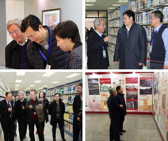 在中關村校區圖書館,專家們參觀了一層大廳的“傳書印記,從延安走來——圖書館特色典藏展”。展覽展出了北京理工大學發展歷史變遷中的部分館藏文獻和與辦學思想相關的徐特立手稿,帶讀者一起回顧和探究我們學校曾經的歷史使命。隨后,專家們參觀了中外文社科圖書和中文自科圖書閱覽室,了解了館藏圖書和閱讀推廣等方面的情況,同時專家也指出目前我館與國內外一流大學圖書館存在的差距。在四層,專家們參觀了“矢志軍工——國防軍工科學家展”,展覽包括彭士祿、王越、丁敬、徐更光、朵英賢、董海山、崔國良七位科學家的各類手稿、書信、證書、信件、著作、音視頻等資料,科學家們在軍工科研的道路上艱辛的探索,給專家們留下了深刻的印象。在深入走訪中,專家組成員安黎哲聽取了館長丁剛毅的工作匯報,然后就圖書館的空間拓展、數據庫資源和智能化服務進行了深入交流,提出了服務本科教學的整改問題和發展方向。