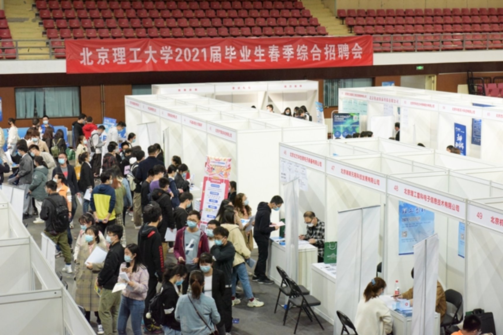 2021年3月31日和4月1日,我校連續兩天在體育館主館舉辦了北京理工大學2021屆畢業生春季大型綜合招聘會。作為今年春季最大型的綜合類招聘活動,本次招聘會共吸引了包括國務院發展研究中心、中國科學院、中國工程物理研究院、中國兵器工業集團、國防科技大學、京東方科技集團、中軟國際、普華永道在內的政府機關、科研機構、高校、央企國企、外企、民企等240余家用人單位前來招賢納才,為畢業生提供7千余個優質工作崗位,招聘需求基本涵蓋我校全部專業。