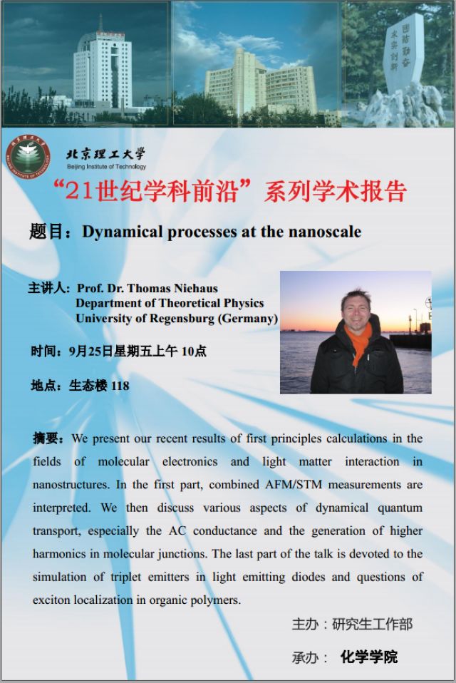 【化學學院】“21世紀學科前沿”Thomas-Niehaus學術報告通知