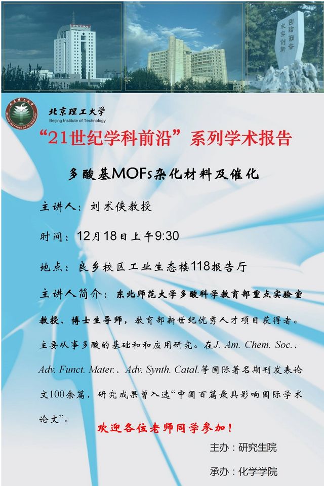 【化學(xué)學(xué)院】“21世紀(jì)學(xué)科前沿”劉術(shù)俠教授學(xué)術(shù)報(bào)告通知