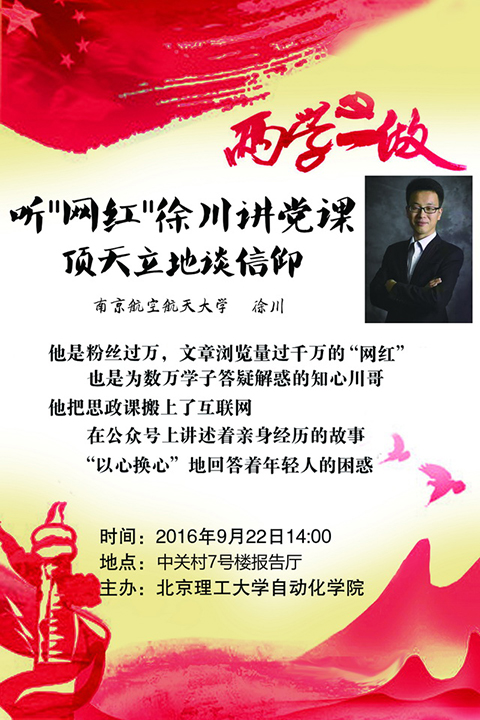 徐川,男,漢族,1982年7月生人,中共黨員。2008年月起擔(dān)任輔導(dǎo)員,現(xiàn)任南京航空航天大學(xué)能源與動力學(xué)院黨委副書記,講師,研究生學(xué)歷,碩士學(xué)位。