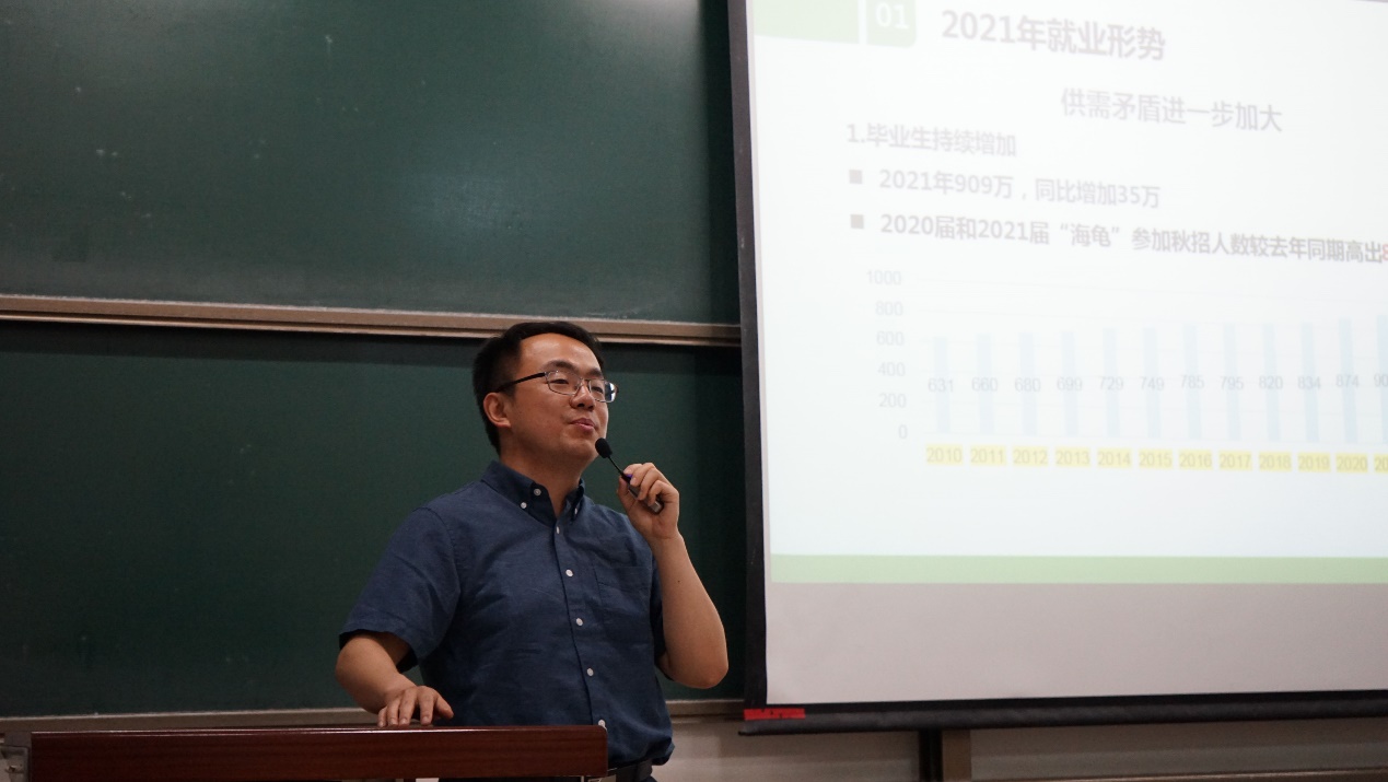 緊接著張龍澤老師開始了講座的第一部分:2021年就業(yè)形勢。面對這個問題,張龍澤老師發(fā)表自己的感嘆,表示2021年就業(yè)形式越來越嚴(yán)峻,就業(yè)壓力越來越大。造成這種現(xiàn)象的原因是求職節(jié)奏。2019年秋招順利進行,但是由于2020年疫情影響,畢業(yè)生求職過程受到了影響。伴隨著畢業(yè)生數(shù)量持續(xù)增加,海歸參加秋招所占比例逐漸擴大,未來三年就業(yè)形勢不會變好。面對這種形勢,張龍澤老師給即將找工作的同學(xué)們的建議是:認(rèn)清自己的形式,及時就業(yè)。而對大一、大二的同學(xué),由于安全和政策方面的問題,出國的不確定性參加,考研的形式更加嚴(yán)峻,國內(nèi)升學(xué)難度加大,張龍澤老師給同學(xué)們的建議是:提前關(guān)注考研的動態(tài),關(guān)注專業(yè)的發(fā)展方向,早日規(guī)劃自己的未來,不要迷茫。