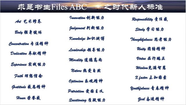 三全導師引領計劃是“求是Files ABC計劃”中的重要內容。求是Files ABC計劃以培養“胸懷壯志 明德精工 創新包容 時代擔當”的領軍領導人才為核心,從理想信念(Faith)、雙創潛能(Innovation)、雙領才能(Leadership)、力行品質(Experience)、學術素養(Sdudy)、美育素養(Art)、體格素養(Body)和愛心公益(Charity)8個方面入手,為學生打造全方位成長成才之路。針對上述8個方面,求是書院分別制定了“求是人格塑造計劃”“求是創意指導計劃”“求是干部養成計劃”“求是品格踐行計劃”“求是學業加速計劃”“求是美育提升計劃”“求是書生強健計劃”“求是善行公益計劃”,每個計劃涵蓋至少兩個具體實施方案。隨著書院制的持續推進,求是書院的人才培養計劃將循序展開。