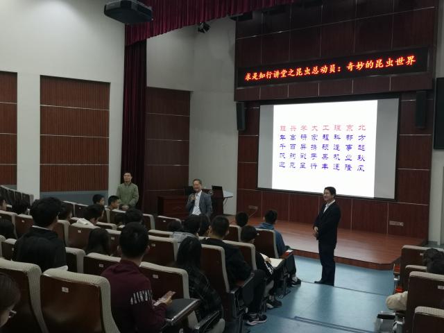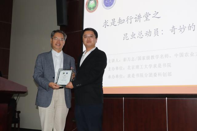 10月14日晚,北理工求是書院知行講堂第四期在良鄉校區綜合教學樓報告廳舉行。國家杰出青年科學基金獲得者,享受政府特殊津貼人員,國家級教學名師,中國農業大學植保學院副院長彩萬志教授帶來題為“奇妙的昆蟲世界”的專題報告。求是書院專職副院長周芳集老師出席報告會并為彩萬志教授頒發了求是書院校外導師聘書,來自求是書院的160余名同學聆聽了報告會。報告會由求是書院團委書記、綜合辦公室主任張鋒老師主持。