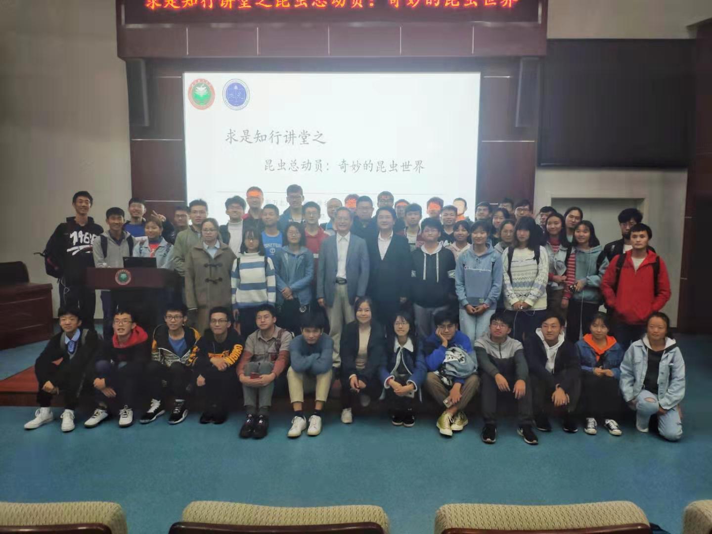 首先,彩教授從昆蟲的定義講起,通過生動的描述讓同學們清晰掌握了昆蟲的科學定義,凝練昆蟲種類多、歷史長、數量大、分布廣的特征,并指出昆蟲是世界上最大的類群。其次,彩教授以蜜蜂等益蟲為例,介紹了昆蟲對人類社會發展的重要性,通過介紹人類歷史上防治蝗蟲等害蟲的史料記載,證明人類研究昆蟲的重要性,他同時強調,正是在毛主席等新中國第一代領導集體的帶領下,破解了病蟲害難題,將思政教育巧妙融合于科普教育之中。最后,彩教授從中國傳統文化方面著眼,展示與昆蟲相關的傳統節日多達2000個,通過重點介紹,深入詮釋昆蟲在人類社會發展過程中所產生的文化影響深遠綿長。
