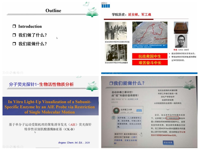 張小玲教授的講座主要分為introduction、我們做了什么和我們能做什么三個(gè)部分。首先,教授簡(jiǎn)要地介紹了化學(xué)與化工學(xué)院,從歷史沿革、學(xué)科專業(yè)、化學(xué)、化工專業(yè)的特質(zhì)、人才培養(yǎng)和代表性研究等方面向大家做了簡(jiǎn)要說明。然后,教授主要從分子探針和納米探針兩個(gè)方面較為詳細(xì)地為大家介紹了一些專業(yè)方面的知識(shí)。隨后,張小玲教授向大家介紹了疫情期間,北理工人為防疫抗疫做出的貢獻(xiàn),為大家展示了化學(xué)與化工學(xué)院的諸多在讀大學(xué)生在家里開展的一些與防疫抗疫相關(guān)的課題。