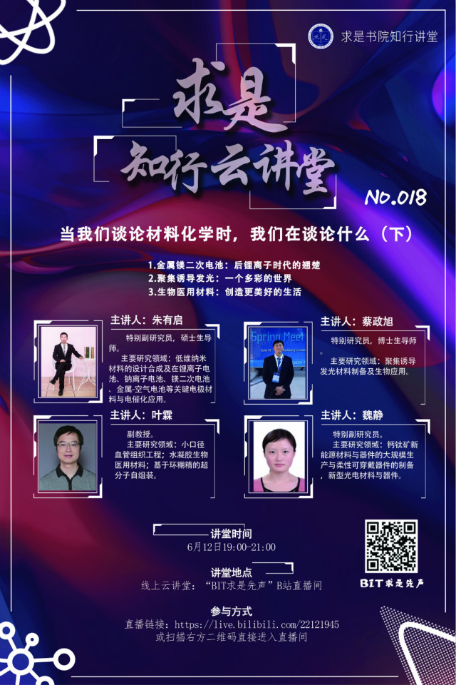帶著這些疑問,6月12日,求是書生在嗶哩嗶哩平臺聆聽了求是知行講堂第十八期——當我們談論材料化學時,我們在談論什么?(下)。本期知行云講堂繼續邀請到了材料學院材料物理與化學系的蔡政旭老師、葉霖老師、朱有啟老師和魏靜老師作為主講人,為大家講授關于材料化學的知識,同時也向大家介紹材料物理與化學系,讓即將進行專業選擇的大一新生對材料物理與化學系有了更深的了解。本次知行講堂由求是書院與材料學院合辦,材料物理與化學系承辦,分為上下兩期為求是書生進行材料化學的科普講座。其中,第十七期——當我們談論材料化學時,我們在談論什么?(上)已經于6月5日舉辦。