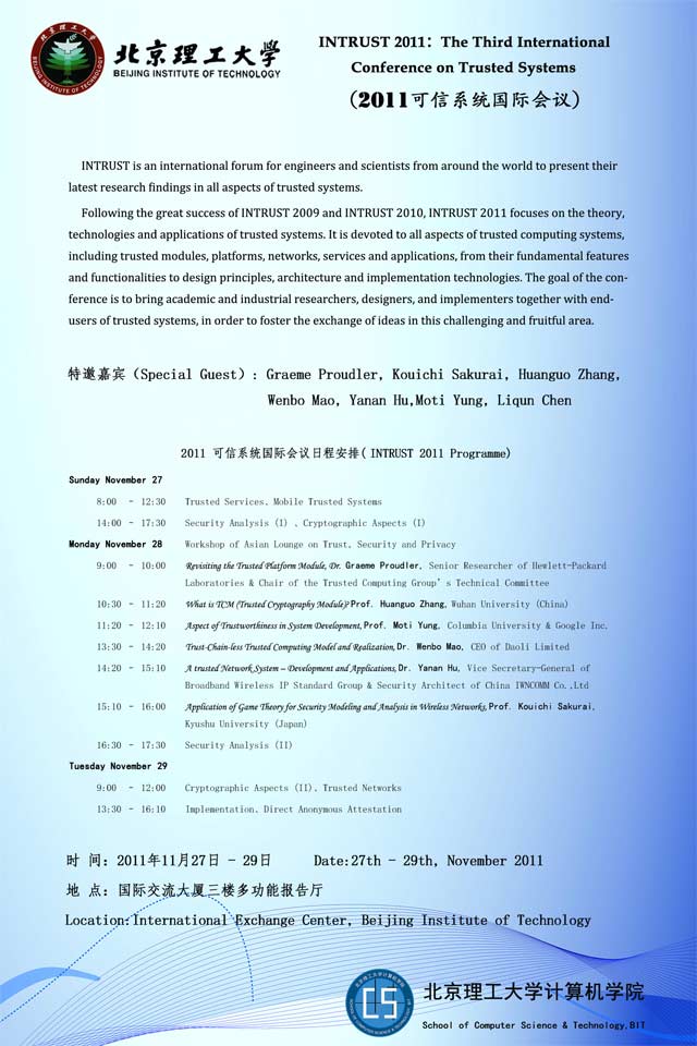 北京理工大學計算機學院主辦并承辦的第三屆可信系統國際會議(INTRUST 2011)將于2011年11月27到29日在北京理工大學國際交流中心召開,會議錄用22篇論文,并在28日邀請到了Graeme Proudler、Moti Yung、Kouichi Sakurai、毛文波、張煥國、Yanan Hu等6位際、國內頂級專家給大會做特邀報告,會議內容涉及可信計算、安全協議、云存儲安全、無線安全等領域內容。邀請感興趣的師生積極參與。