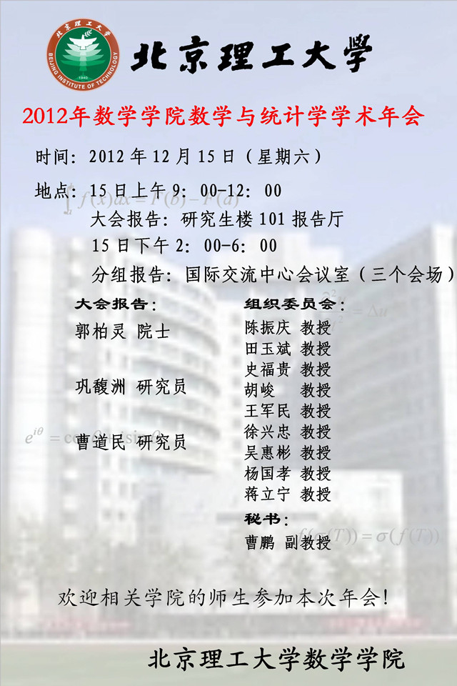 為更好了解國內外數學與統計學的最新進展,加強數學與統計學學科和其他學科之間的交流與合作,提升我校相關學科的知名度,數學學院決定于2012年12月15日召開北京理工大學數學學院數學與統計學學術年會。我們希望通過這樣一次年會,給數學學院及相關學院的老師提供一個交流的平臺,充分展示一年來取得的優秀成果,活躍學術氣氛,加強交流合作。