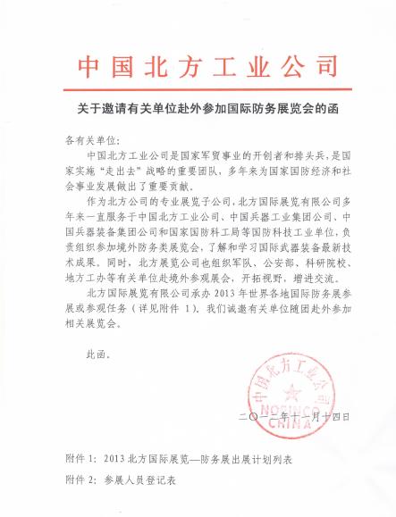 現轉發中國北方工業公司“關于邀請有關單位赴外參加國際防務展覽會的函”,請有需求的單位或老師按通知要求與北方公司的聯系人聯系辦理相關手續。