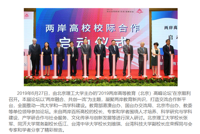 2019年6月27日,由北京理工大學(xué)主辦的“2019兩岸高等教育(北京)高峰論壇”在京順利召開。本屆論壇以“兩岸融合、共創(chuàng)一流”為主題,凝聚兩岸教育新共識,打造交流合作新平臺,全面推動一流大學(xué)和一流學(xué)科建設(shè)。教育部港澳臺辦、國臺辦交流局、北京市臺辦、教委等單位領(lǐng)導(dǎo)參加論壇。來自兩岸百所高校的校長、專家和學(xué)者圍繞人才培養(yǎng)、科學(xué)研究與學(xué)科建設(shè)、產(chǎn)學(xué)研合作與社會服務(wù)、文化傳承與創(chuàng)新發(fā)展等進(jìn)行深入研討。北京理工大學(xué)校長張軍、同濟(jì)大學(xué)常務(wù)副校長伍江、臺灣中華大學(xué)校長劉維琪、臺灣科技大學(xué)副校長莊榮輝同與會專家和學(xué)者分享了精彩報告。