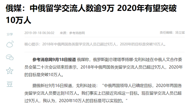 俄媒稱,俄羅斯副總理塔季揚娜·戈利科娃在中俄人文合作委員會第二十次會議結束后表示,2018年中俄兩國各類留學交流人員已超過9萬人,2020年的目標是突破10萬人。