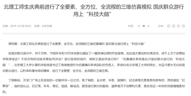 編輯:吳楠 審核:王征 閱讀次數:原文標題:北理工師生慶典前進行了全要素、全方位、全流程的三維仿真模擬 國慶群眾游行用上“科技大腦”