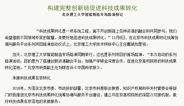 “科技成果轉化是一項系統工程,離不開創新鏈上各種資源的融合和共同參與,我們希望借助不同領域專家的智慧,來更好地促進科技成果轉化。”11月8日,在北京市科技成果轉化統籌協調與服務平臺系列項目路演啟動儀式上,北京理工大學技術轉移中心主任戴斌如是說。