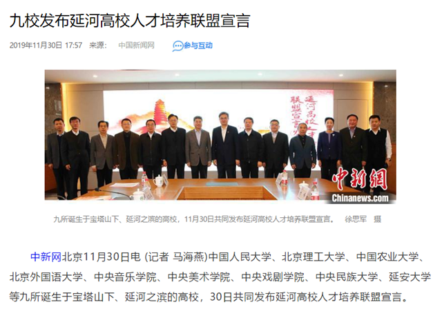 中國人民大學、北京理工大學、中國農業大學、北京外國語大學、中央音樂學院、中央美術學院、中央戲劇學院、中央民族大學、延安大學等九所誕生于寶塔山下、延河之濱的高校,30日共同發布延河高校人才培養聯盟宣言。