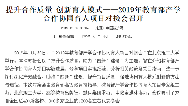 2019年11月30日,“2019年教育部產學合作協同育人項目對接會”在北京理工大學舉行。本次對接會以“提升合作質量,助力‘四新’建設”為主題,旨在介紹教育部產學合作協同育人項目實施進展,分享項目實施經驗,分析相關政策及項目指南,進一步探討深化產教融合、助推“四新”建設,提升項目質量、促進協同育人模式創新的方法與途徑。本次對接會由教育部高等教育司指導,教育部產學合作協同育人項目專家組主辦,北京理工大學、高等教育出版社、慧科集團承辦,中教全媒體協辦。會議吸引了來自全國近400所高校、300多家企業的1200名左右代表參會。