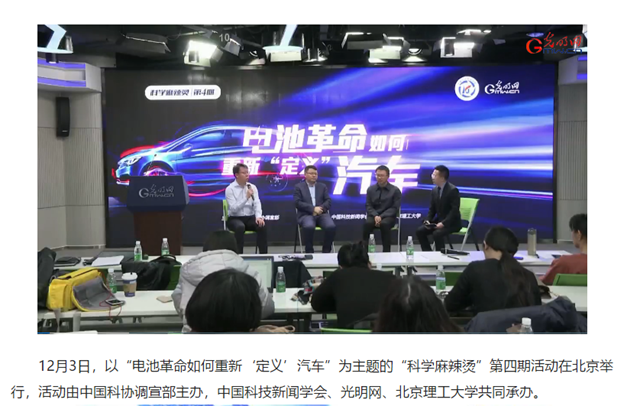 12月3日,以“電池革命如何重新‘定義’汽車”為主題的“科學麻辣燙”第四期活動在北京舉行,活動由中國科協調宣部主辦,中國科技新聞學會、光明網、北京理工大學共同承辦。