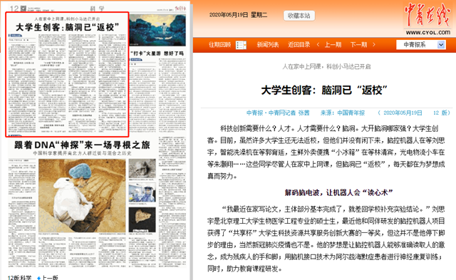 “我最近在家寫論文,主體部分基本完成了,就差回學校補充實驗結論。”劉思宇是北京理工大學生物醫學工程專業的碩士生,最近他和同伴研發的腦控機器人項目獲得了“共享杯”大學生科技資源共享服務創新大賽的一等獎,但這并不是他停下腳步的理由,當然新冠肺炎疫情也不是。他的夢想是讓腦控機器人能夠準確讀取人的意念,成為殘疾人的手和腳;用腦機接口技術為阿爾茲海默癥患者進行神經康復訓練;同時,助力教育課程研發。