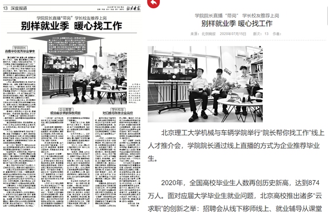 上個月,在北理工機械與車輛學院首場線上人才推介會上,張世杰拿到了企業的工作邀約。那天,“海歸”院長、長江學者特聘教授姜瀾親自舉賢薦才,5家企業負責人帶崗赴約,借助視頻連線,散布于五湖四海的北理工畢業生云端應聘,低年級的學生則在線觀摩。