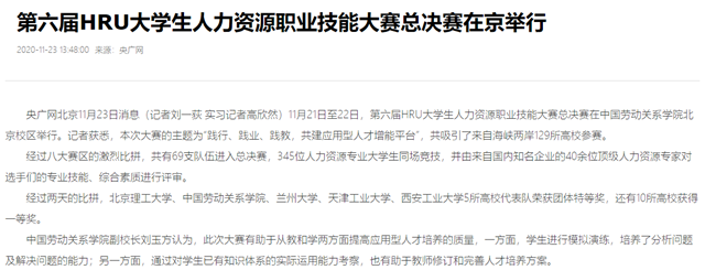 11月21日至22日,第六屆HRU大學生人力資源職業技能大賽總決賽在中國勞動關系學院北京校區舉行。記者獲悉,本次大賽的主題為“踐行、踐業、踐教,共建應用型人才增能平臺”,共吸引了來自海峽兩岸129所高校參賽。