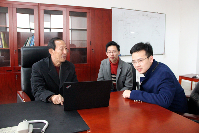 孫華飛(左)對學生曹越琦(中)、張世強(右)開展學術指導