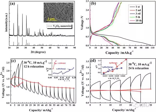 充放電循環:AlyV2O5+3(x-y)e-+4(x-y)Al2Cl7-?AlxV2O5(amorphous)+7(x-y)AlCl4-(y≤x)