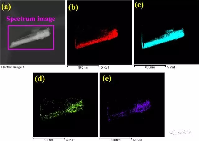 經完全充放電后,超聲洗滌正極材料,確保無電解液粘附在納米線上,再進行TEM-EDS測試。結果可以看到正極材料經放電后仍然保持著納米線的形貌,在納米線中可明顯看到O,V,Al和Ni元素的分布。EDS結果排除了電解液粘附的干擾,是Al3+嵌入V2O5中的確鑿證據。