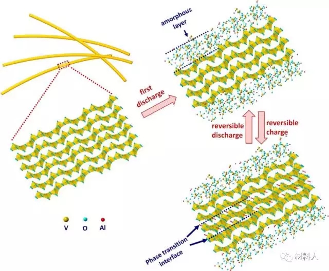 首周放電:V2O5+4xAl2Cl7-+3xe-→AlxV2O5(amorphous)+7xAlCl7-