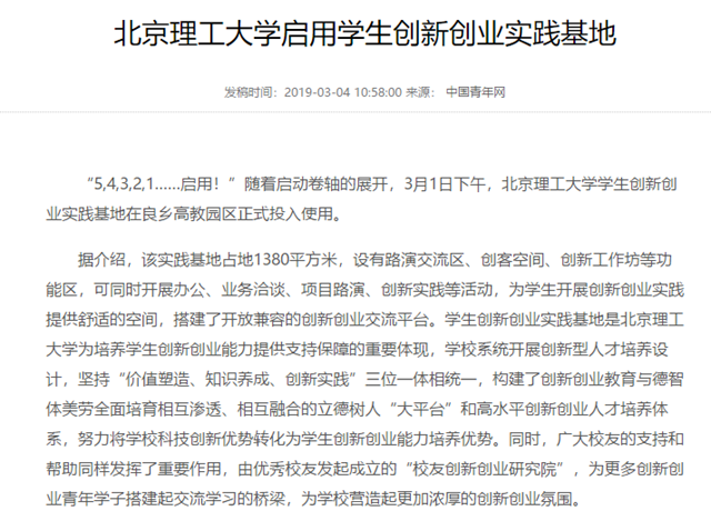 【中國(guó)青年網(wǎng)】北京理工大學(xué)啟用學(xué)生創(chuàng)新創(chuàng)業(yè)實(shí)踐基地