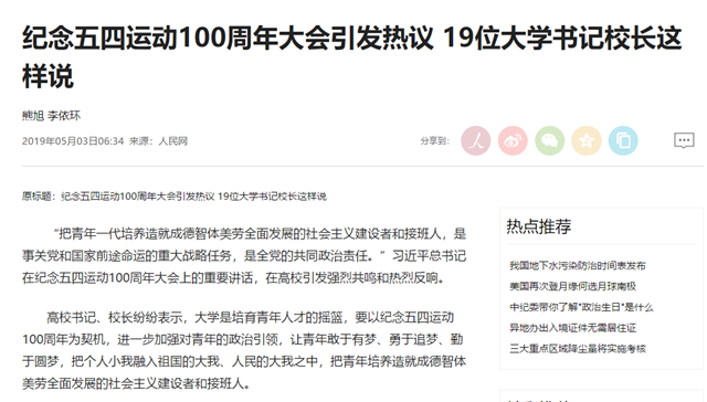 【人民網】紀念五四運動100周年大會引發熱議 19位大學書記校長這樣說