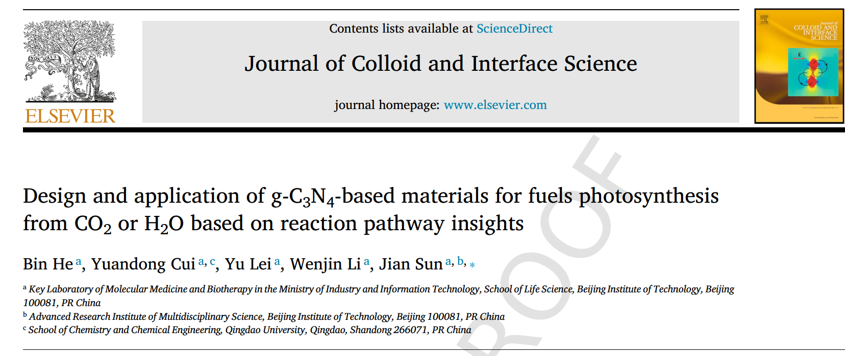 編輯:肖雯 審核:周連景 閱讀次數:近日,北京理工大學生命學院綠色生物制造團隊在石墨相氮化碳(g-C3N4)光化學材料方面發表綜述文章,相關成果以“Design and Application of g-C3N4-based Materials for Fuels Photosynthesis from CO2 or H2O Based on Reaction Pathway Insights”為題發表于頂級期刊《Journal of Colloid and Interface Science》(影響因子9.965),北京理工大學生命學院2019級博士生賀濱為第一作者,通訊作者為孫劍教授。