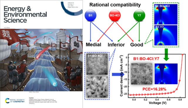 編輯:隆哲源 審核:王振華 閱讀次數:近日,北京理工大學化學與化工學院碩士研究生蔣夢云以第一作者身份在國際頂級期刊Energy Environmental & Science (IF: 38.5)發表題目為“Rational compatibility in a ternary matrix enables all-small-molecule organic solar cells with over 16% efficiency”的研究論文,此論文被選為該雜志2021年第7期的Front Cover。北京理工大學為第一通訊單位,北京理工大學安橋石特別研究員、王金亮教授和北京交通大學張福俊教授為共同通訊作者,本研究得到了國家自然科學基金,北京市自然科學基金和北京理工大學青年教師學術啟動計劃等項目的資助及北京理工大學分析測試中心的支持。