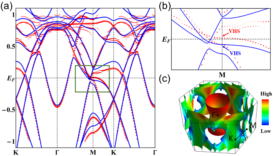 為了解釋電荷密度波和超導之間的這種競爭關系,我們進行了第一性原理計算,如圖3所示:第一性原理計算結果表明Nb的摻雜使得M處的范霍夫奇點發生了變化,Nb摻雜使范霍夫奇點從低于費米能量移動到高于費米能量,使其被填充的能量態密度被耗盡,因而減弱了電荷密度波;同時,Nb的摻雜使得?處的電子口袋擴大,這為超導配對提供了更多的電子態密度,因而提高了超導性,我們結果揭示了Cs(V1-xNbx)3Sb5體系中電荷密度波和超導之間不同尋常的競爭。相關工作得到了南京大學聞?;⒔淌谡n題組的合作,成果以Letter的形式發表在Physical Review B上 [PRB 105, L180507 (2022)]。