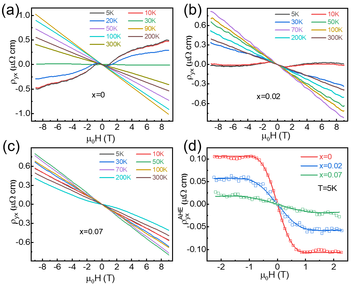 為了探索Kagome超導體CsV3Sb5超導性和電荷密度波的產生機制以及其內在聯系,博士生李永愷(現為北理工物理學院博士后)在王秩偉研究員的指導下成功地合成了Nb摻雜Cs(V1-xNbx)3Sb5單晶樣品,發現這個體系的Nb摻雜極限為7%,通過XRD結構精修證實Nb替代V位,從而對該體系的VSb二維Kagome格子層進行有效調控。進一步系統研究了體系的電荷密度波和超導電性隨Nb摻雜量的變化。通過電輸運測量發現Nb摻雜可以逐漸抑制電荷密度波同時增強了超導電性,最高超導溫度為4.45K,這表明電荷密度波和超導之間存在競爭關系,如圖1所示。同時,隨著Nb摻雜量的提高,反?;魻栃c電荷密度波一起顯著減弱,這為反?;魻栃c電荷密度波之間可能存在的密切關系提供了實驗證據,如圖2所示。