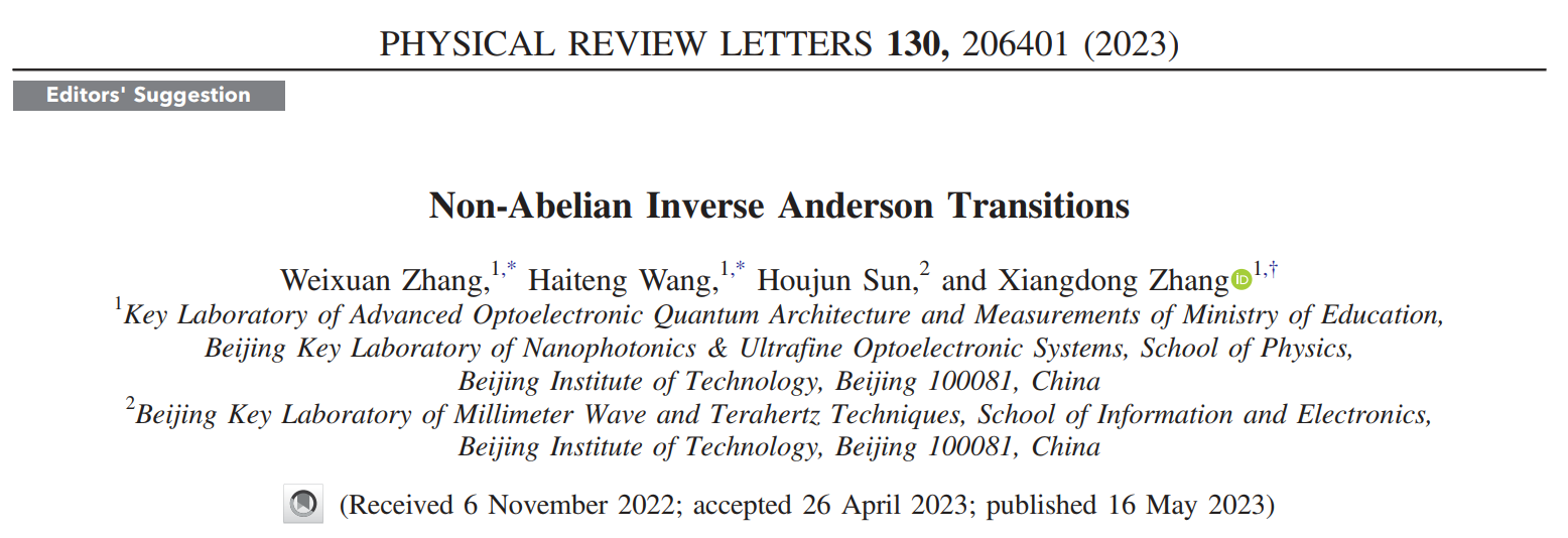 編輯:王莉蓉 審核:陳珂 閱讀次數:日前,北京理工大學物理學院張向東教授課題組和集成電路與電子學院孫厚軍教授課題組開展合作,在拓撲電路和非阿貝爾逆安德森相變研究方面取得重要進展。相關工作發表在Physical Review Letters上 (Phys. Rev. Lett. 130, 206401 (2023)),并獲得編輯推薦(Editors' Suggestion)。研究工作得到了國家自然科學基金委和國家重點研發計劃的資助。北京理工大學物理學院張蔚暄研究員和碩士研究生王海藤為論文的共同第一作者,張向東教授 為通訊作者。