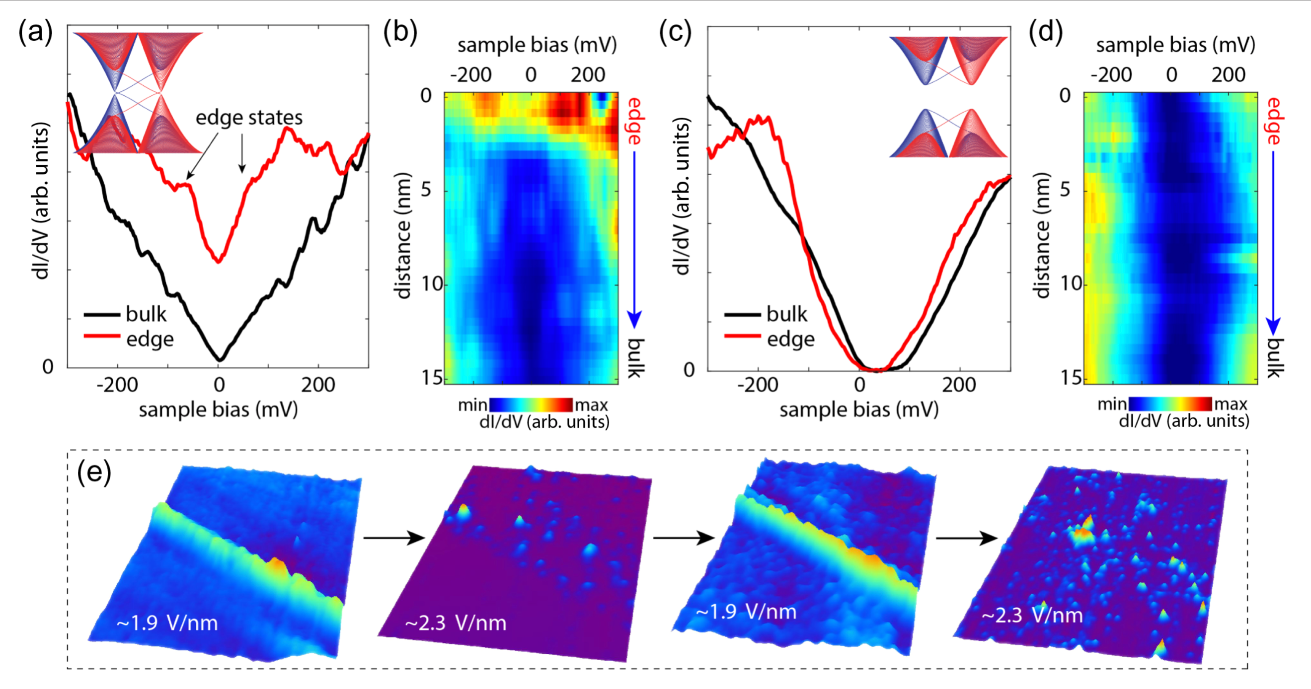 在該工作中,研究人員利用低溫掃描隧道顯微鏡/掃描隧道譜、密度泛函理論和緊束縛計算來證明Ge2Pt(101)上的外延鍺烯是一種具有起伏狀蜂窩結構的量子自旋霍爾絕緣體。在其量子自旋霍爾效應狀態下,鍺烯的拓撲特征在于存在體能隙和金屬性的拓撲邊緣態(圖1)。他們同時控制STM針尖到樣品隧道結中的內置電場以改變鍺烯的拓撲狀態:在臨界電場時,鍺烯的拓撲能隙會閉合,體系轉變為拓撲半金屬;而當電場超過臨界值時,鍺烯會打開拓撲平庸的帶隙,并伴隨著拓撲邊緣態的消失(圖2、圖3)。該工作給出了單元素量子自旋霍爾絕緣體中拓撲相變的第一個實驗證據。這種由電場引起的拓撲狀態切換和相當大的體能隙使鍺烯成為室溫拓撲晶體管的候選材料。