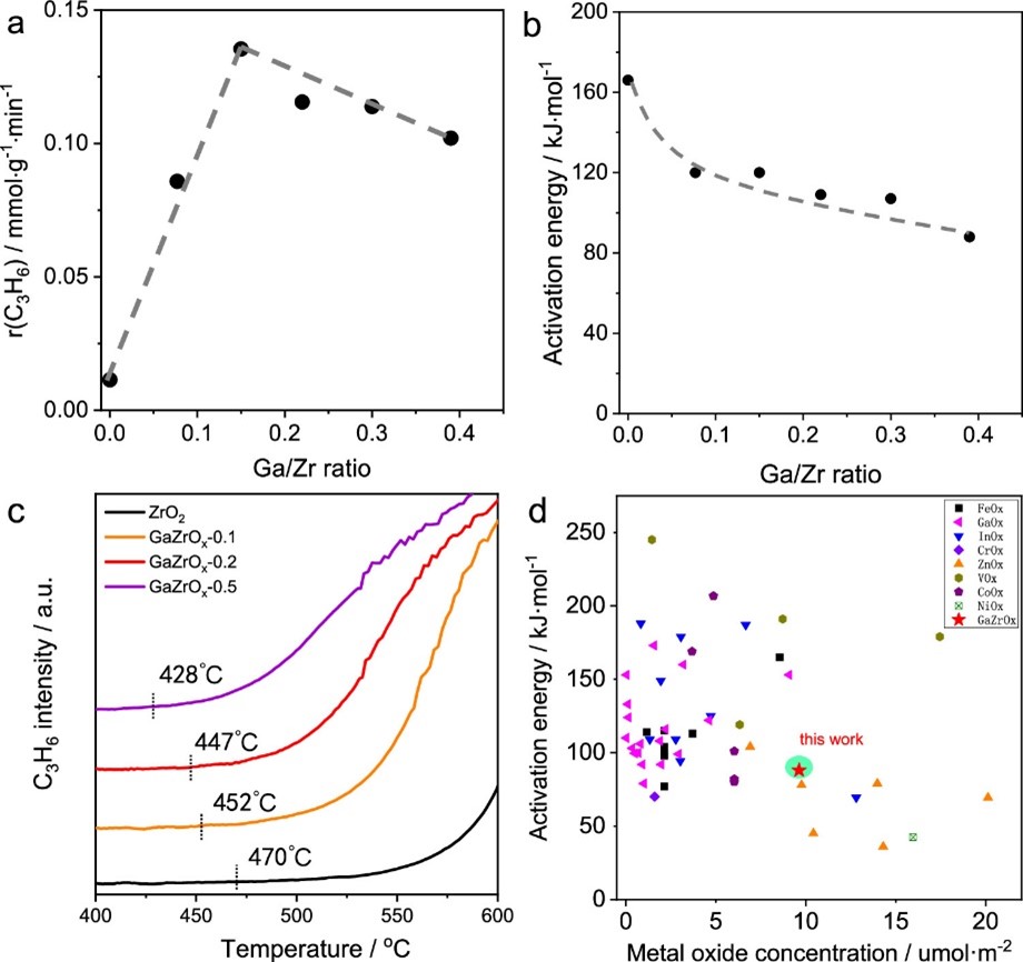 該團隊在前期研究工作的基礎上(Nature Communications, 2018, 9(1): 3794;J Catal, 2019, 371: 313-324;ACS Catalysis, 2020, 10(11): 6377-6388.),重點對ZrO2基催化劑進行金屬改性來提升PDH催化反應性能和調控C-H鍵活化機制。該工作首先通過水熱法合成了系列Ga摻雜ZrO2(GaZrOx)催化劑。活性測試結果表明,在550 ℃,40%C3H8/N2丙烷脫氫反應條件下,GaZrOx催化劑丙烯生成速率大幅提高,而Ga/Zr摩爾比是影響丙烯生成速率的重要參數,活性與Ga/Zr比呈火山型曲線。當Ga/Zr比為0.2時,GaZrOx活性最高,初始丙烯生成速率為0.1354 mmol·g-1·min-1,是純相ZrO2的11倍左右。活化能隨著Ga/Zr的增加呈現下降趨勢,說明Ga的引入改變了ZrO2催化劑的活性位點種類,產生了本征活性更高的催化位點。C3H8-TPSR結果同樣證明了新活性位點的生成。將本文GaZrOx催化劑在丙烷脫氫中的活化能與文獻報道的其他金屬氧化物基催化劑進行對比,可以看到GaZrOx具有較低的反應活化能,展現出良好的丙烷脫氫應用前景(圖1)。