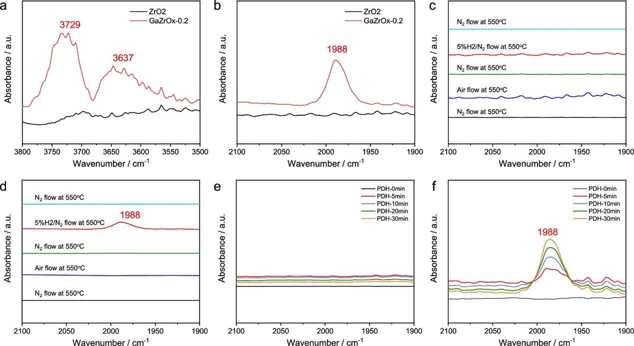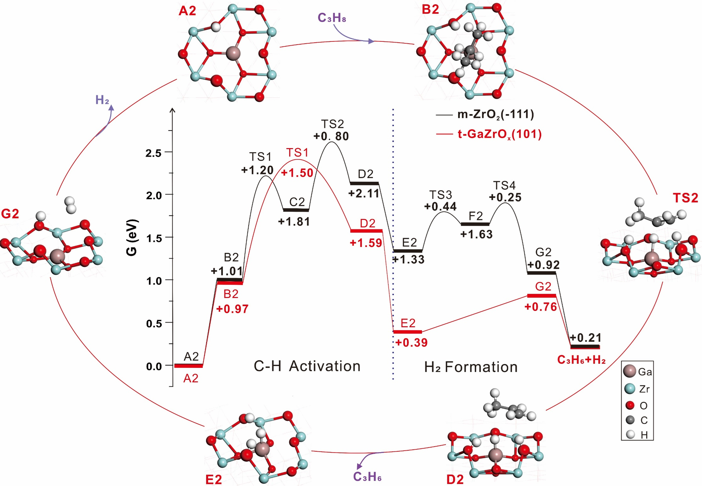 為了闡述GaZrOx催化劑在PDH中的反應中間體和催化機理,采用原位紅外(in situ DRIFTS)和DFT計算對代表性的ZrO2和GaZrOx?0.2催化劑進行研究。In situ DRIFTS結果表明,GaZrOx?0.2在1988 cm-1出現歸屬于Ga-H物種的振動峰,說明Ga原子會參與到PDH反應過程,且該振動峰強度隨反應時間的增加而增加,表明Ga?H物種持續生成并積累,而在ZrO2上沒有觀察到類似的信號。DFT計算結果表明,在ZrO2中摻雜Ga使得丙烷脫氫反應中C?H鍵的活化方式由逐步機制變為協同機制,降低了C-H鍵的活化能壘,Ga?O?Zr?O結構是GaZrOx催化劑PDH活性位點,具有更高的PDH本征活性,與實驗結果相一致。此處所展現的通過金屬摻雜調控金屬氧化物催化劑C?H鍵活化能力的策略同樣適用于其它催化體系中。