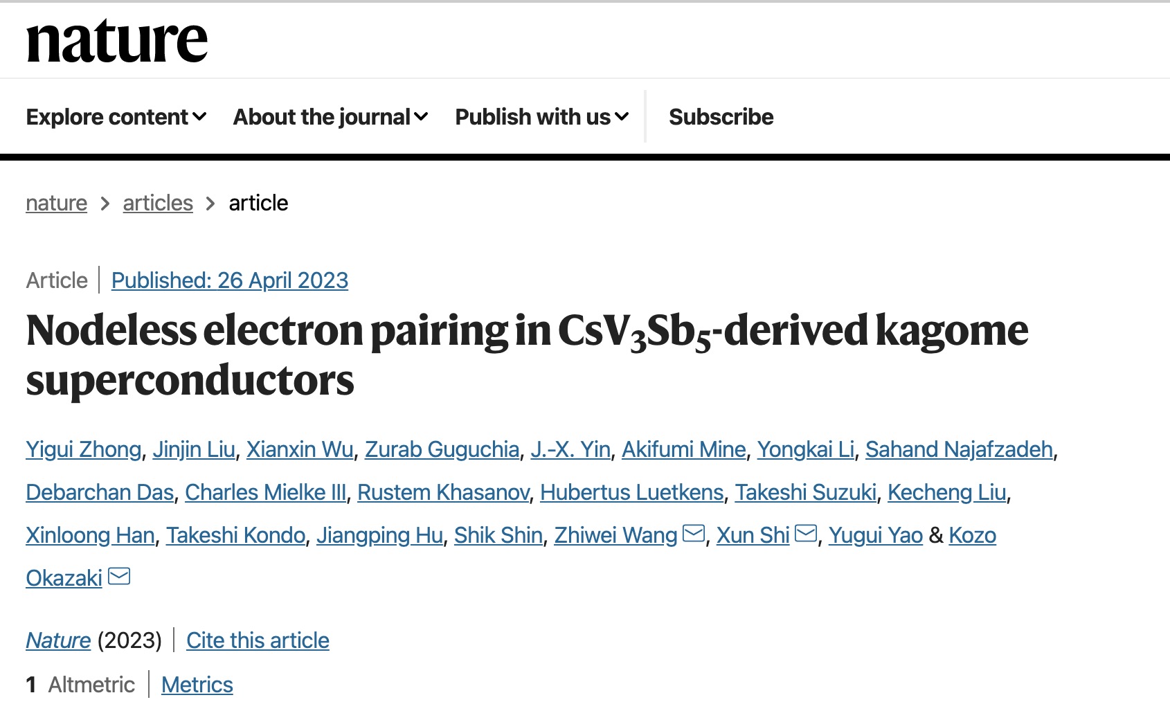 編輯:王莉蓉 審核:陳珂 閱讀次數:近日,北京理工大學物理學院姚裕貴教授、施訓教授、王秩偉研究員團隊,與東京大學鐘益桂博士、Kozo Okazaki教授,中科院理論物理研究所吳賢新研究員,南方科技大學殷嘉鑫教授和瑞士保羅謝勒研究所Zurab Guguchia教授等人合作在《自然》雜志發表論文“Nodeless electron pairing in CsV3Sb5-derived kagome superconductors”,揭示了籠目超導體中穩健的無節點超導能隙,為研究其超導配對機理提供了關鍵實驗依據。