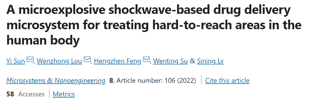 編輯:王雪 審核:王亞斌 閱讀次數:近日,北京理工大學機電學院婁文忠教授課題組在體內難觸及區(qū)域靶向治療及止血消殺微系統(tǒng)應用方面的重要研究進展發(fā)表在Nature旗下國際頂級期刊Microsystems & Nanoengineering(影響因子8.006),相關成果以“A microexplosive shockwave-based drug delivery microsystem for treating hard-to-reach areas in the human body” 為題發(fā)表。該工作的第一作者為北京理工大學機電學院博士研究生孫毅,通訊作者為北京理工大學機電學院婁文忠教授和馮恒振博士后,北京理工大學為論文的第一單位。