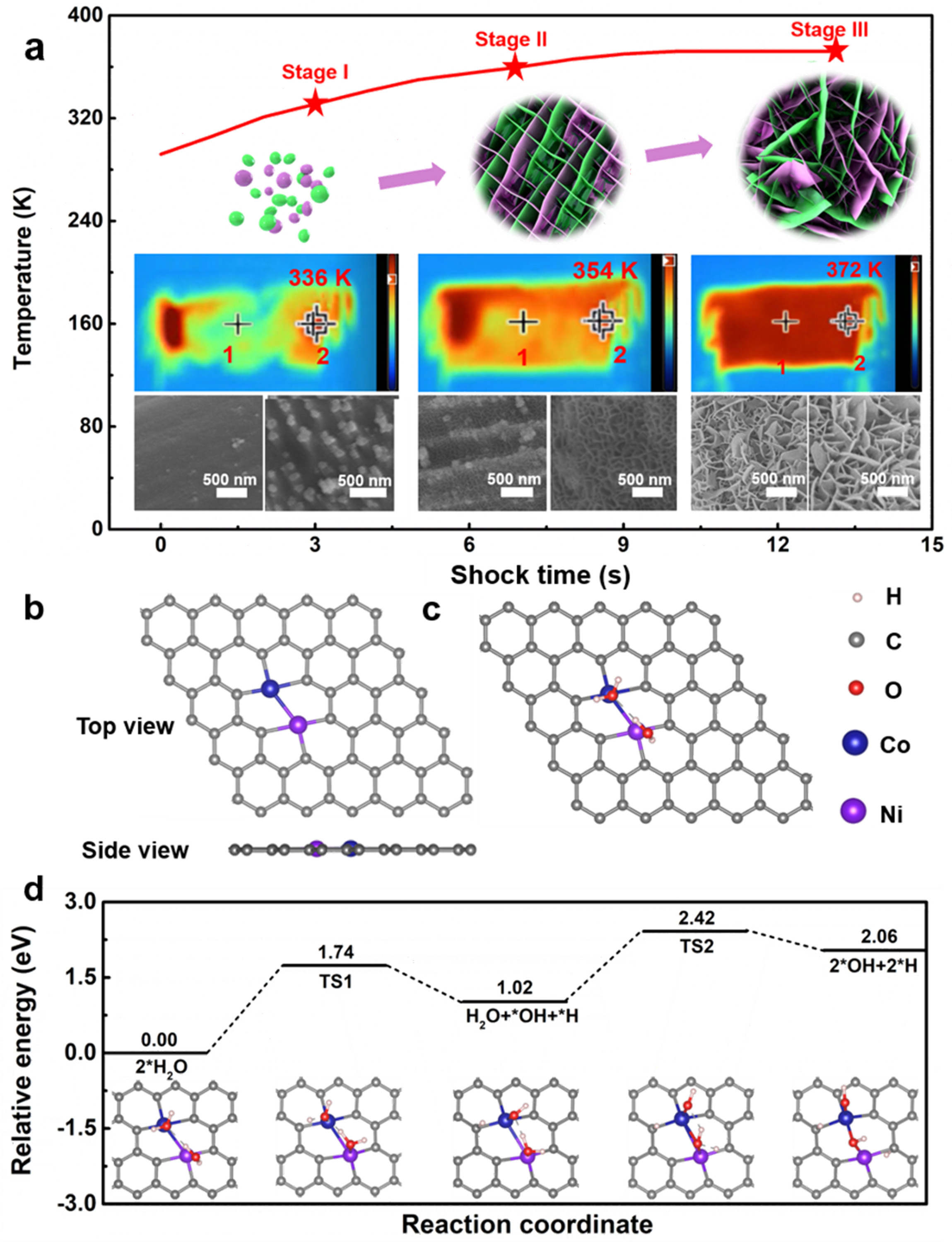 為了在分子水平上深入了解NiCo-LDH的形成機制,進行了DFT計算。NiCo LDH的形成被建模為H2O分子在嵌入石墨烯的Ni和Co金屬中心的吸附,即NiCo/石墨烯(圖3b),然后H2O分解生成NiCo(OH)2。H2O分子在NiCo/石墨烯上的結合在熱力學上是有利的,計算的吸附能為-1.19 eV。然后,H2O分子在Ni和Co位點連續分解(圖3c)。在Ni位點將H2O分解為Ni-OH和*H,上坡時為1.02eV,勢壘為1.74 eV;并且在Co位點進一步分解H2O是1.04 eV,勢壘為1.40 eV(圖3d)。總的來說,H2O在NiCo/石墨烯上的分解是吸熱的2.06 eV,勢壘是2.42 eV,轉換能量單位是232.68 kJ/mol。根據CC上NiCo-LDH的總負載(~92.87 g/mol)(1.0 mg/1.0 cm-2),在整個系統中打破反應1的能量勢壘所需的能量約為15.0 J。此外,整個系統從293 K到372 K的溫度變化如圖3a所示。整個系統的加熱過程約為13秒。這樣,定性計算出熱沖擊產生的能量為~ 3900 J,一部分用于加熱溶液,一部分用于反應。進一步,根據水分子的比熱容,我們可以估算出溶液加熱所需的能量約為3318 J,扣除溶液加熱所需的能量后,剩余的~ 582 J遠大于打破反應勢壘所需的~ 15 J?;谝陨峡紤],整個合成過程的機理可以概括為熱震法獲得的大量能量可以打破整個反應的能壘從而驅動反應,最終在基體上生成目標相。而且由于溶液中碳布中心溫度較高,反應動力學大大增強,反應時間急劇減少。