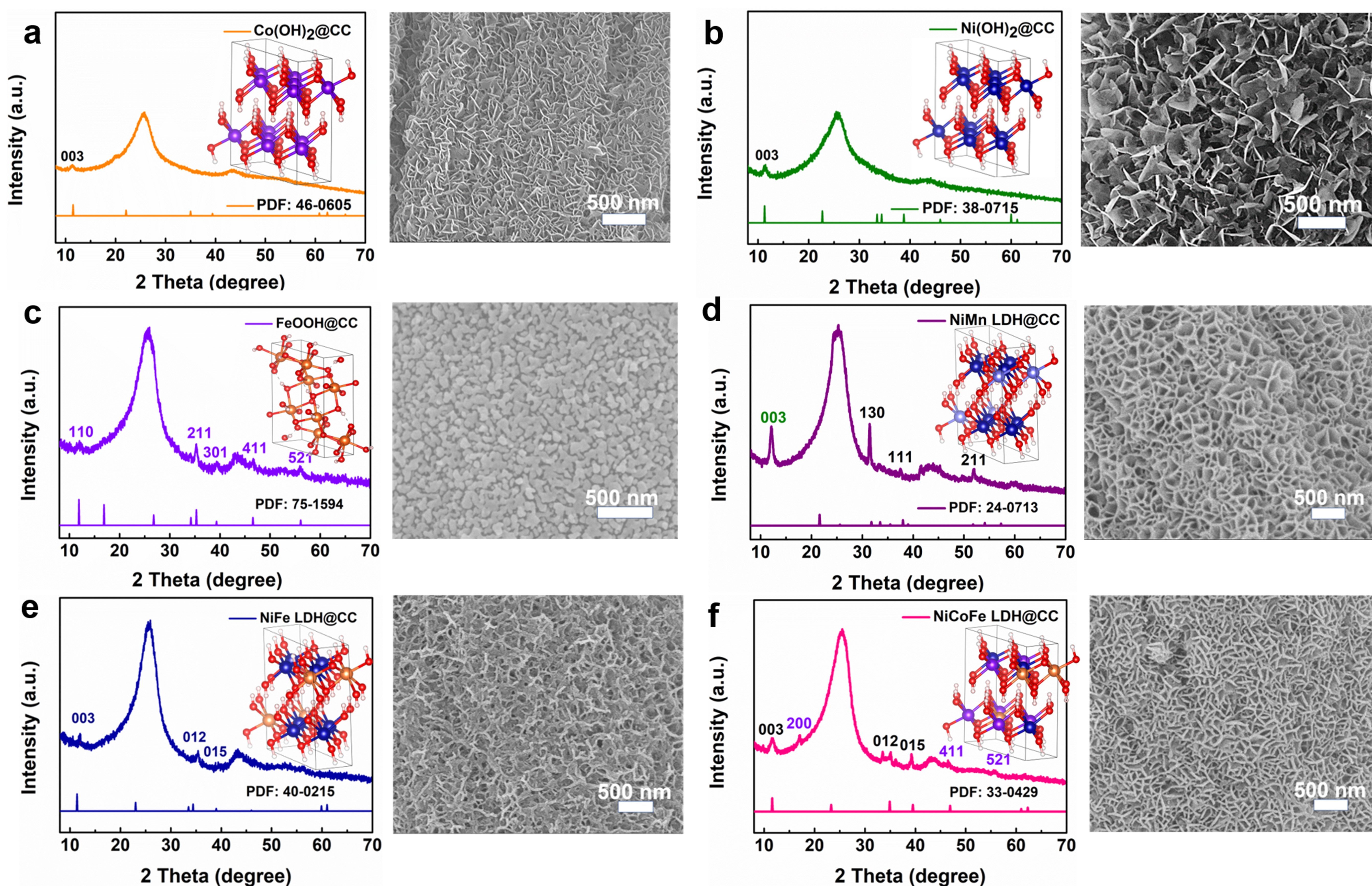 為了進一步考察我們合成技術的通用性,成功合成了一系列金屬氫氧化物復合材料,包括單一過渡金屬LDHs (例如Co(OH)2@CC、Ni (OH)2@CC和FeOOH@CC )、二元( NiMn LDH@CC和NiFe LDH@CC)和三元過渡金屬LDH復合物(NiCoFe LDH@CC ) (圖4 )。XRD譜圖也有很好的對應說明材料的成功制備。