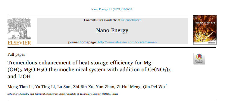 編輯:隆哲源 審核:王振華 閱讀次數(shù):近期,北京理工大學(xué)化學(xué)與化工學(xué)院武欽佩教授團(tuán)隊(duì)在儲(chǔ)能科學(xué)技術(shù)領(lǐng)域取得階段成果。研究成果以“Tremendous enhancement of heat-storage efficiency for Mg(OH)2-MgO-H2O thermochemical system with addition of Ce(NO3)3 and LiOH”為題,12月18日在線發(fā)表于 Nano Energy (https:///doi.org/10.1016/j.nanoen. 2020.105603)。北京理工大學(xué)化學(xué)與化工學(xué)院研究生李夢(mèng)甜和李亞婷為共同第一作者,北京理工大學(xué)是唯一作者單位。