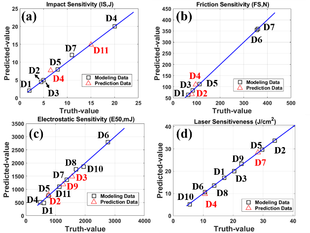 圖6 基于PCA-PLS的預測模型:(a)沖擊感度、(b)摩擦感度、(c)靜電感度和(d)激光感度