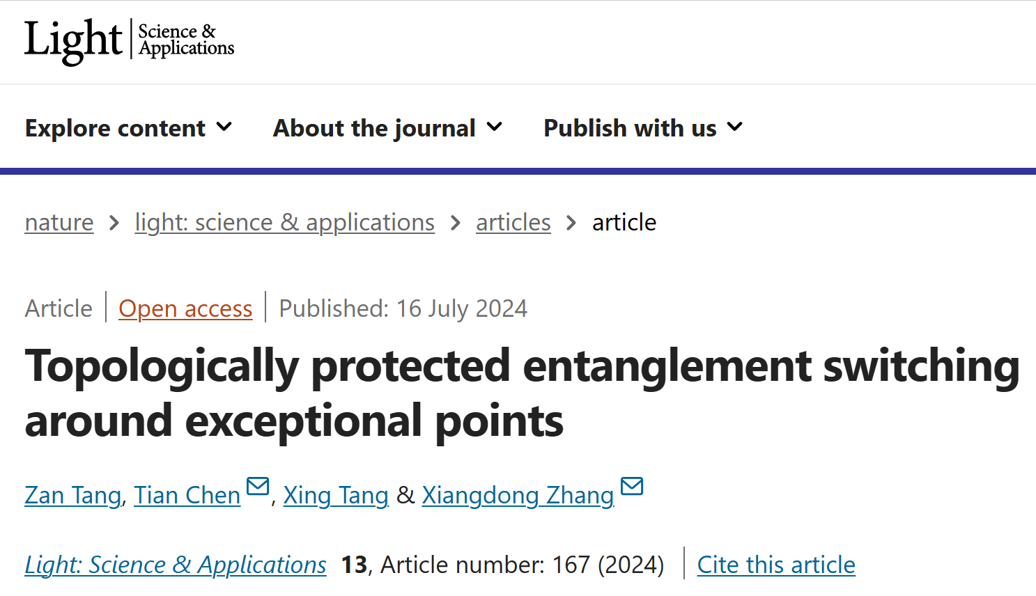 編輯:王莉蓉 審核:陳珂 閱讀次數:近日,北京理工大學物理學院張向東教授課題組通過設計四階簡并奇異點,實現了拓撲保護的糾纏態手性開關。相關成果以“Topologically Protected Entanglement Switching Around Exceptional Points”為題發表在Light: Science & Applications期刊[Light Sci. Appl. 13, 167 (2024)]上。該研究工作得到了國家自然科學基金委的大力支持。北京理工大學物理學院湯贊博士、陳天副教授為該論文的共同第一作者,北京理工大學物理學院陳天副教授、張向東教授為論文共同通訊作者,北京理工大學物理學院博士生唐杏也為該工作做出了重要貢獻。