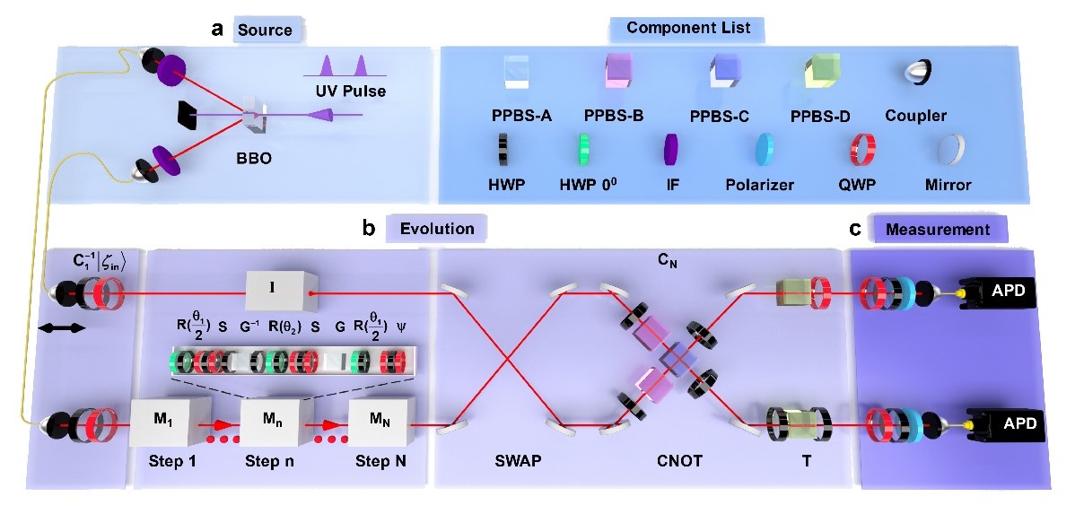 在演化過程中,一個光子在自由空間傳播,另一個光子進入量子行走模塊。旋轉算符通過使用角度為零的綠色半波片和角度為